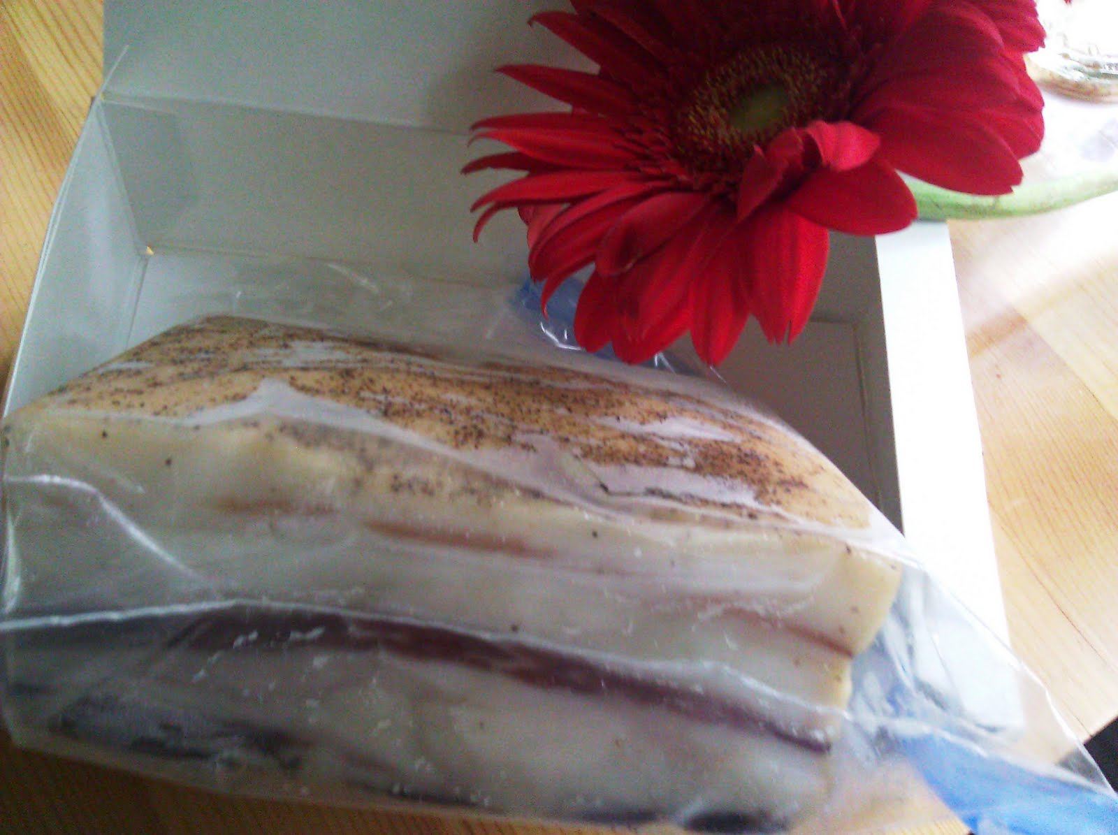 Look closely. That's home-cured pancetta! And it's mangalitsa pancetta at that. How could I have missed it? When you visit my friend's blog, The Daily Palette, you will have all the clues that hint at what she loves. She loves gardening and cooking; she loves mangalitsa pork and who is into charcutepalooza. It may sound like I'm talking Greek, but drop by The Daily Palette and you will understand what I mean.